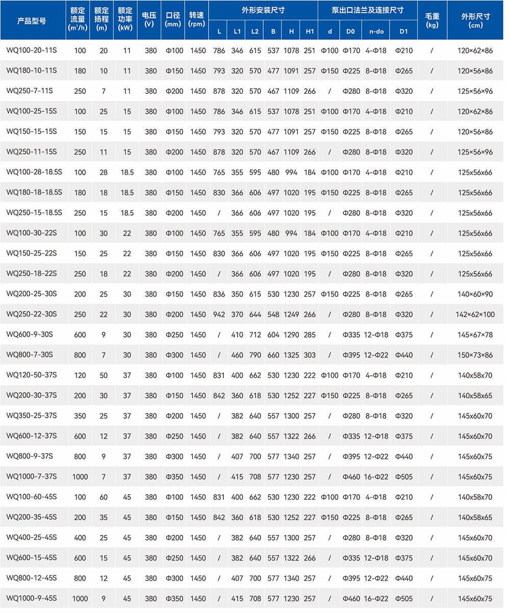 國標法蘭WQ-S全不銹鋼精密鑄造污水污物潛水電泵采用不銹鋼精密鑄造外殼,具有耐腐蝕、環保型、揚程高、流量大等特點。