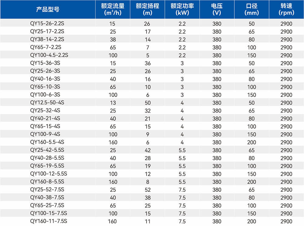 QY系列充油式小型潛水電泵(以下簡稱電泵)由水泵、密封、電動機(jī)三部分組成。水泵位于電泵上部為離心式或軸流式結(jié)構(gòu);電動機(jī)位于電泵下部為充油式三相異步電動機(jī);水泵與電動機(jī)之間采用內(nèi)裝式整體機(jī)械密封盒密封,各固定止口密封處采用“O"形耐油橡膠密封圈作靜密封。